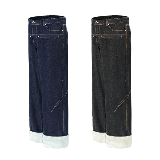 Color blocked pockets, rolled edges, denim straight leg pants